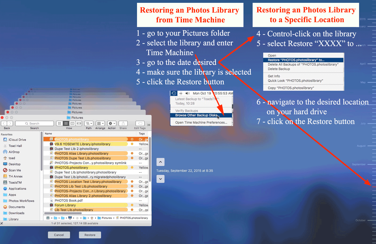 Here are a few steps to recover the photo library through time machine: To restore the pictures from the time machine backup you need to follow a few simple steps. First select the iphoto library from where the photos have been lost in the iphoto library.
